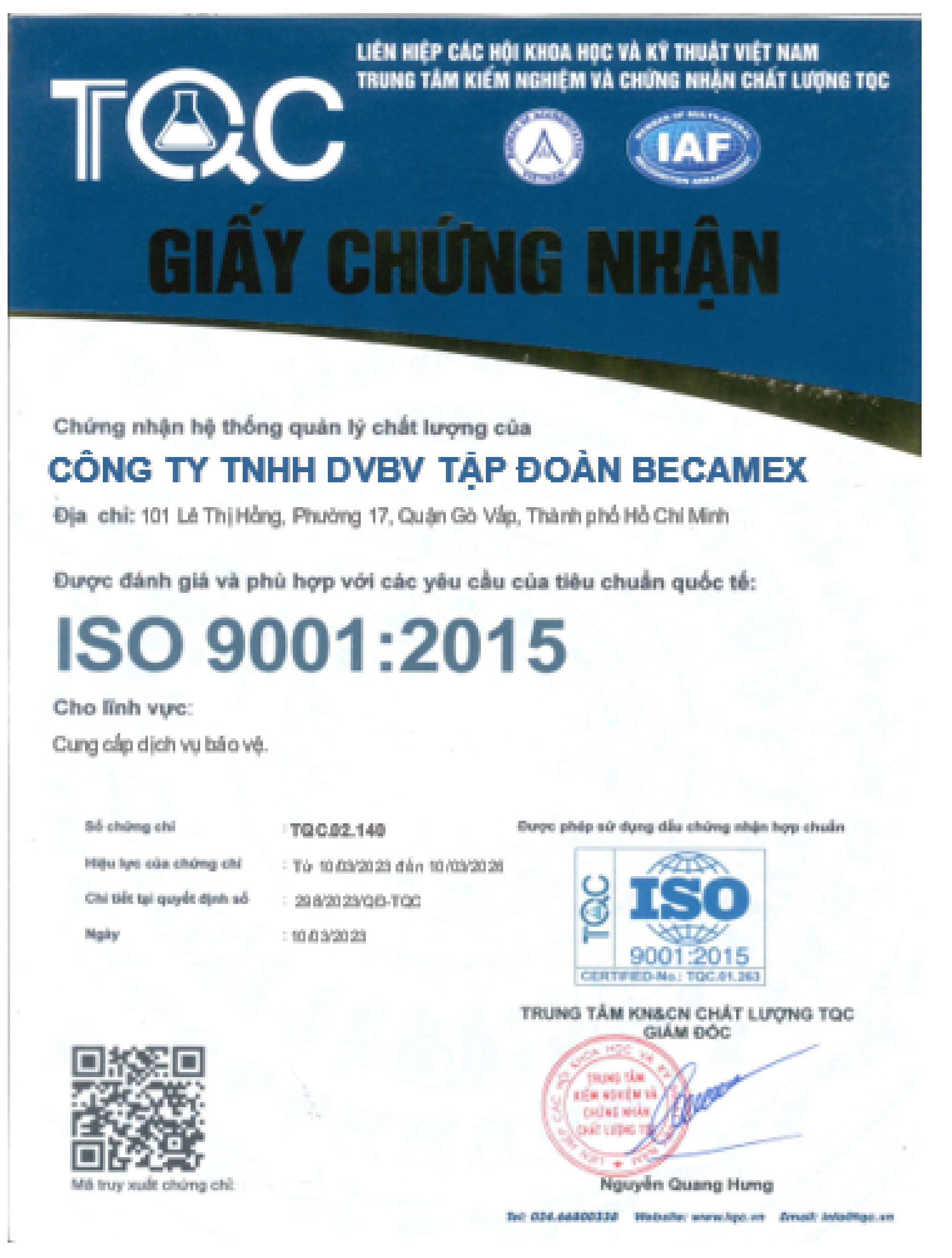 CHỨNG NHẬN TIÊU CHUẨN CHẤT LƯỢNG